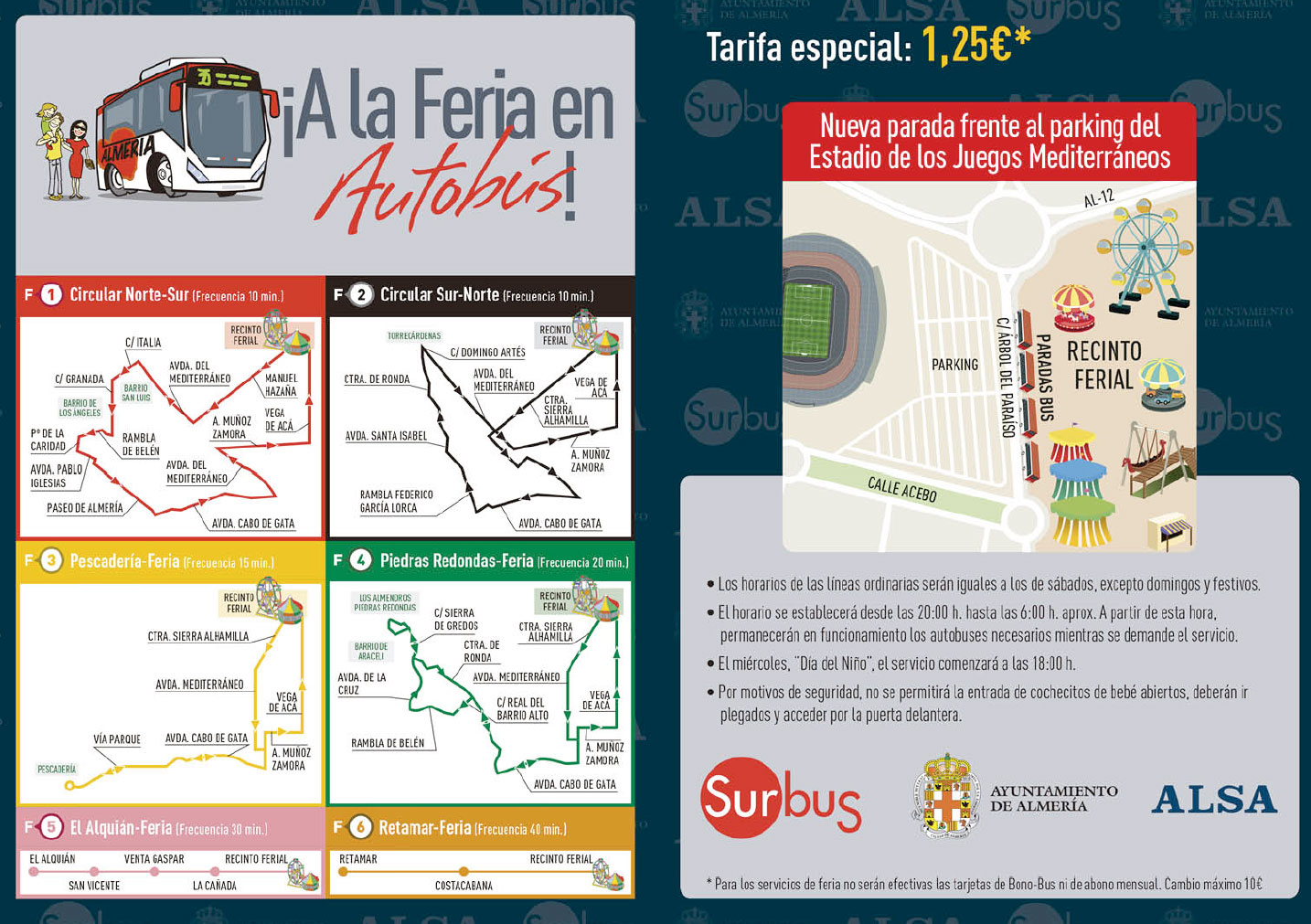Para llegar al Recinto Ferial que está situado en la zona de la Vega de Acá, os recomendamos que cojáis las líneas de autobús que han sido diseñadas para esta ocasión festiva. Pero también existe la posibilidad de acercarse andando, puesto que la ciudad de Almería no tiene grandes distancias o dejar el coche en los varios aparcamientos que el Ayuntamiento dispone en la Vega de Acá los días de Feria, con un coste de 5€ para todo el día.