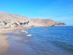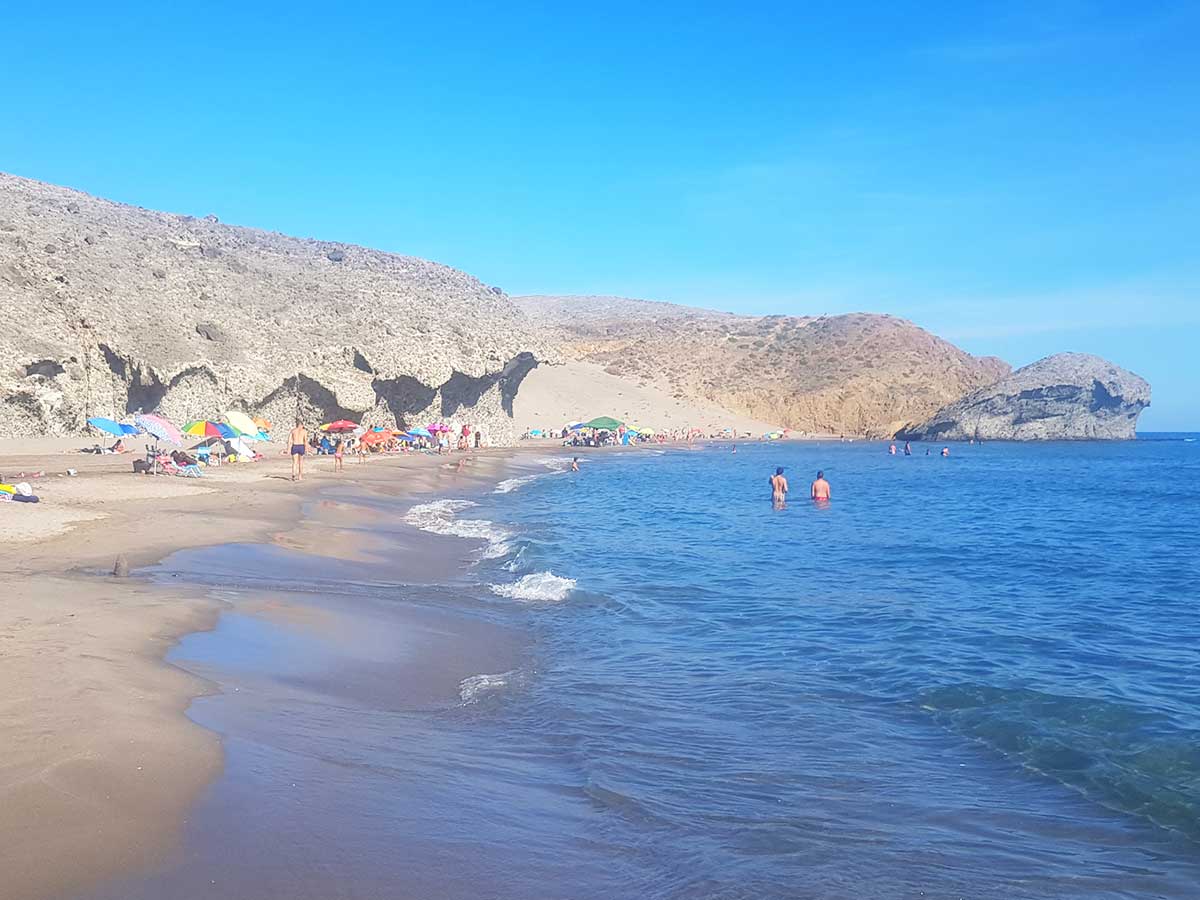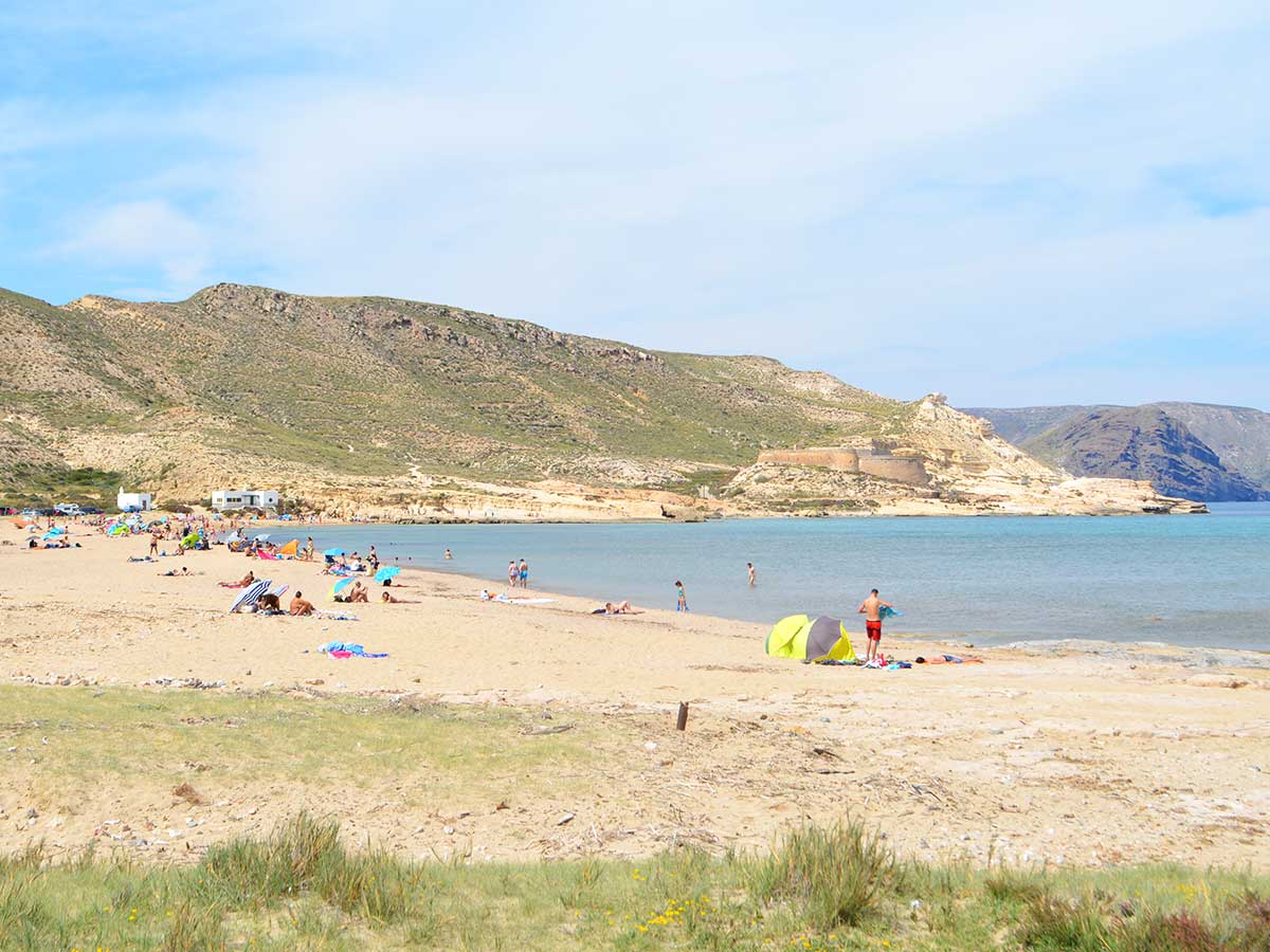 En el barrio de San Miguel de Cabo de Gata de Almería nos encontramos con la playa más grande del parque natural, más de 4 kilómetros de playa, debido a la enormidad de este arenal incluso en verano la ocupación es baja. La composición de la arena es gruesa, en su mayor parte, aunque también hay zonas de arena más fina.